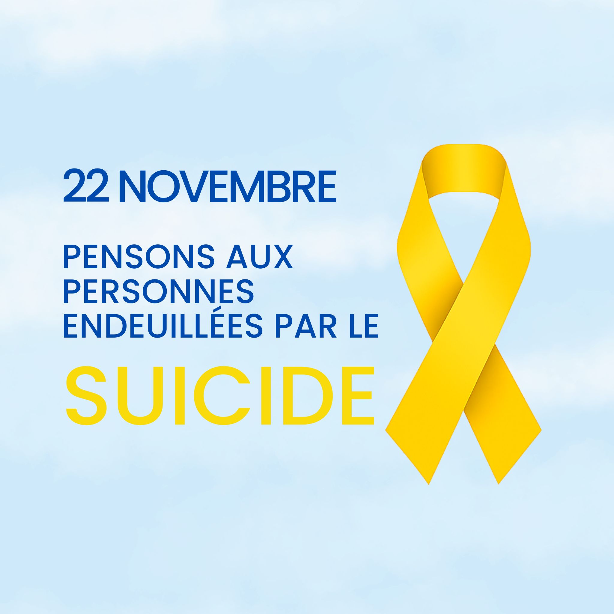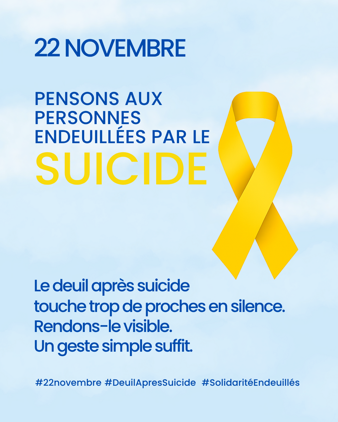 Le 22 novembre, nous souhaitons mettre en lumière le deuil après suicide et soutenir les proches endeuillés. Pour cela, nous lançons un geste symbolique : chacun peut changer sa photo de profil et/ou partager le visuel officiel.