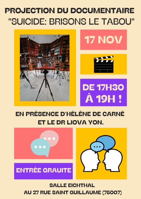 Suicide, brisons le tabou : nouvelle projection du documentaire d’Edgar Mermet est prévue le 17 novembre à 17h30 à SciencesPo Paris